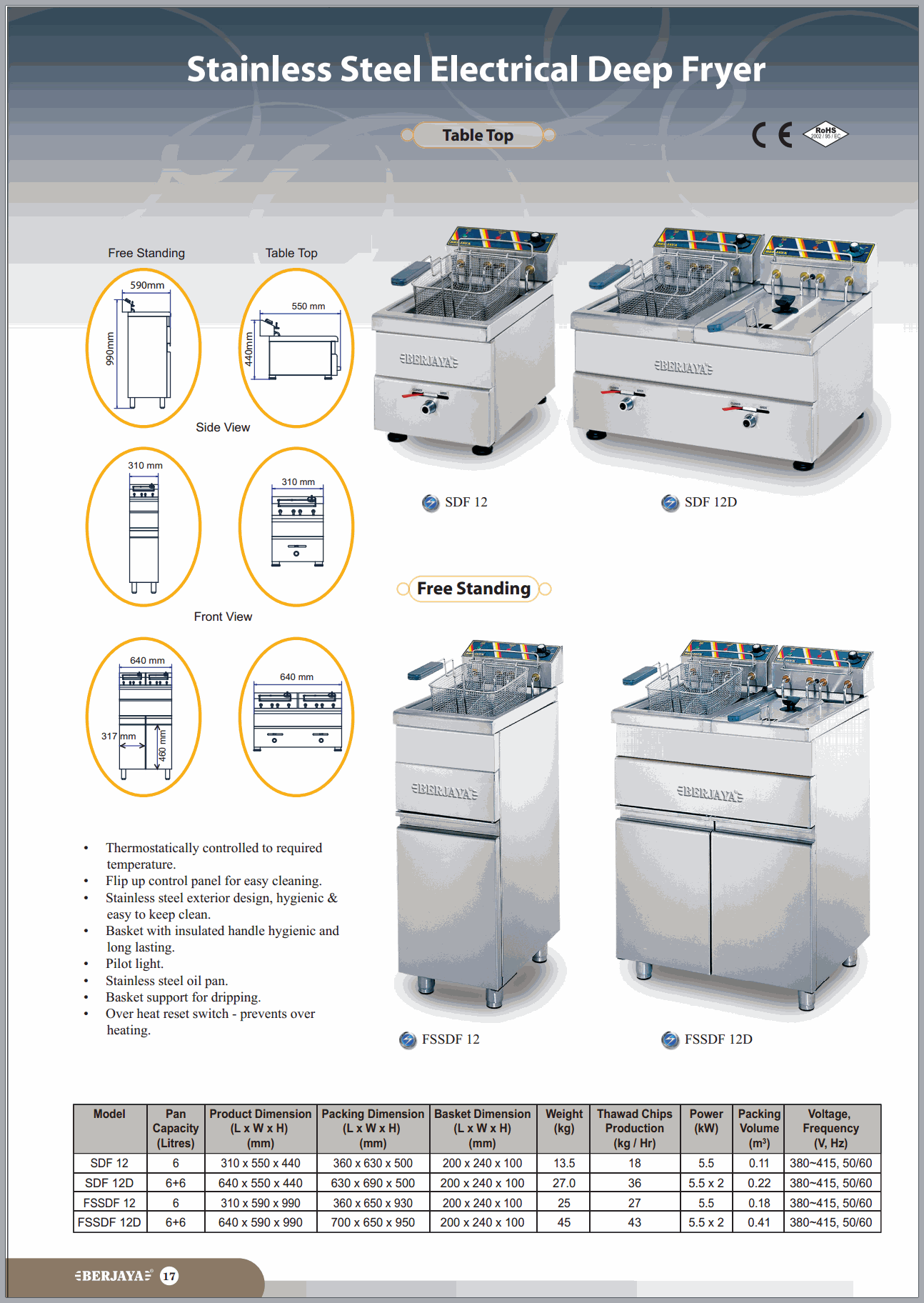 CHIÊN NHÚNG ĐIỆN ĐƠN - Model : FSSDF12- Nhãn hiệu : BERJAYA (Malaysia)- Dung tích : 6 lít- Kích thước : 310x590x990 mm- Kích thước rổ : 200x240x100 mm- Dùng điện